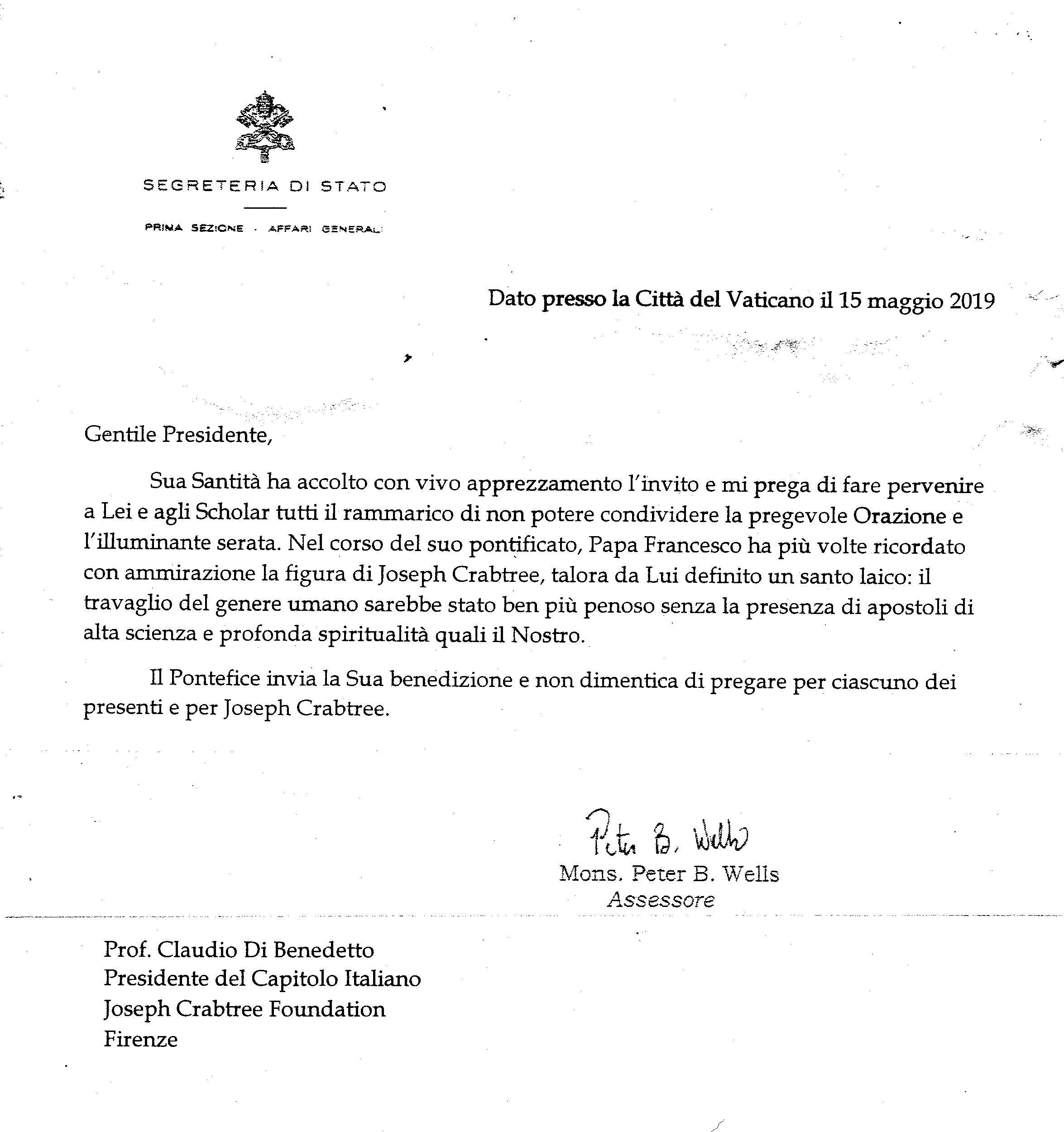 Sua Santità ha accolto con vivo apprezzamento l'invito e mi prega di fare pervenire a Lei e agli Scholar tutti il rammarico di non potere condividere la pregevole Orazione e l'illuminante serata. Nel corso del suo pontificato, Papa Francesco ha più volte ricordato con ammirazione la figura di Joseph Crabtree, talora da Lui definito un santo laico: il travaglio del genere umano sarebbe stato ben più penoso senza la presenza di apostoli di alta scienza e profonda spiritualità quali il Nostro.